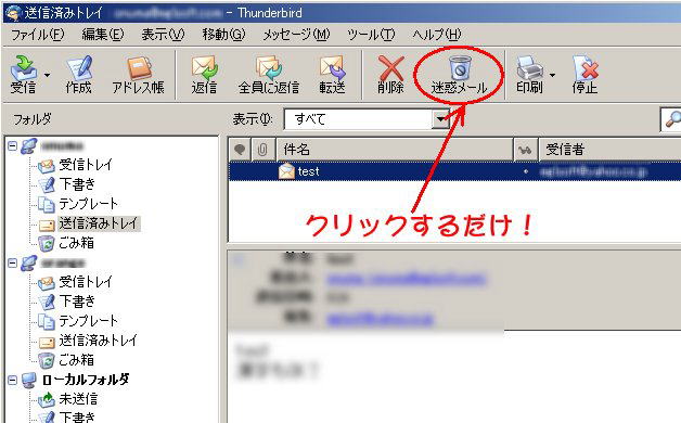 メールソフト(Thunderbird)のスパムメール指定 迷惑メールを選択して、迷惑メールボタンをクリックするだけです。 いくつか指定すると、学習機能が働き、クリックしなくても自動的に迷惑メールマークが付くようになります。